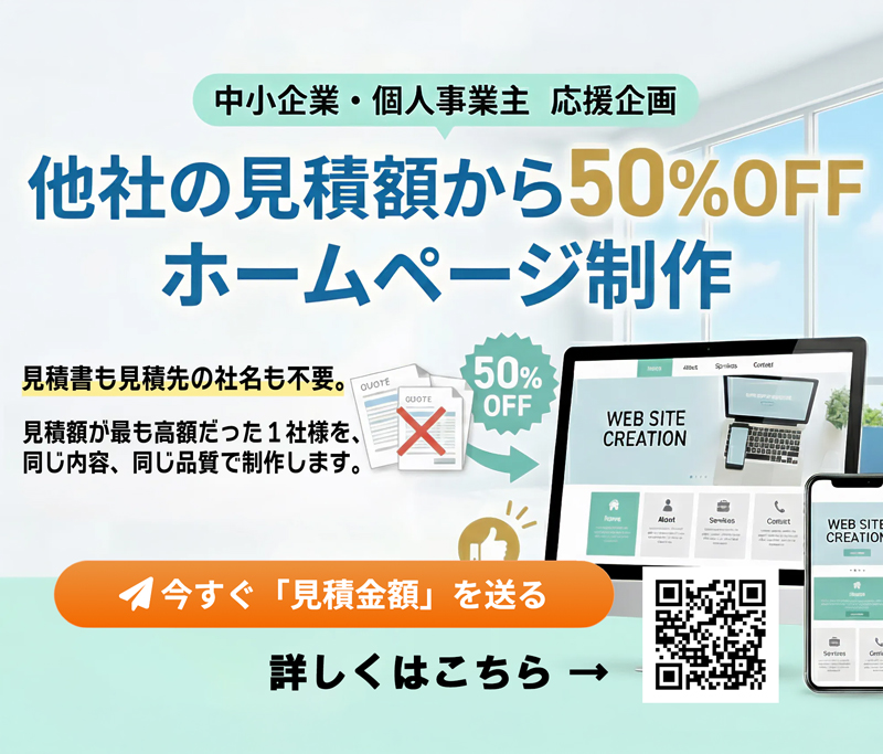 毎月1社限定🤞で他社お見積りの半額(50%OFF)で同様のホームページを制作いたします😍